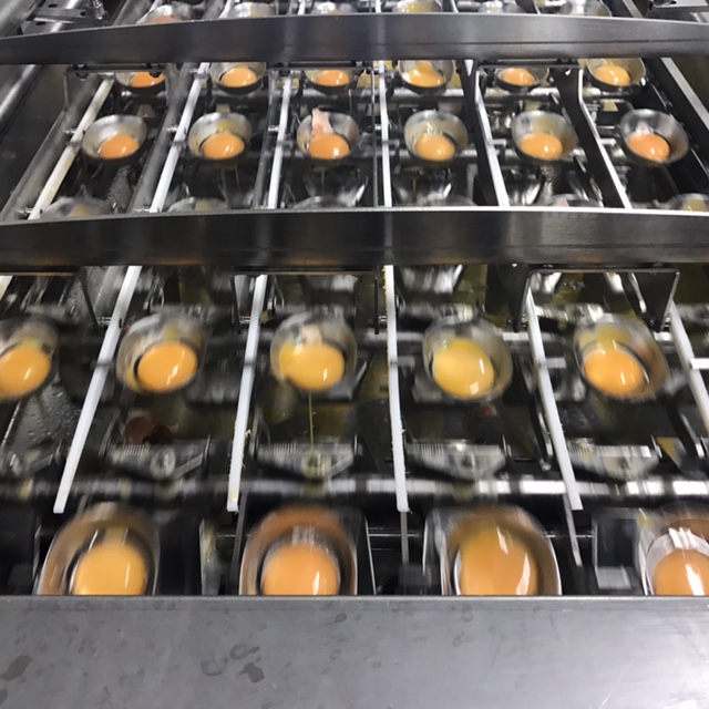 Mediante cazoletas la clara se escurre al fondo y queda separada de la yema o sigue el proceso sin separación para obtener productos de huevo entero.